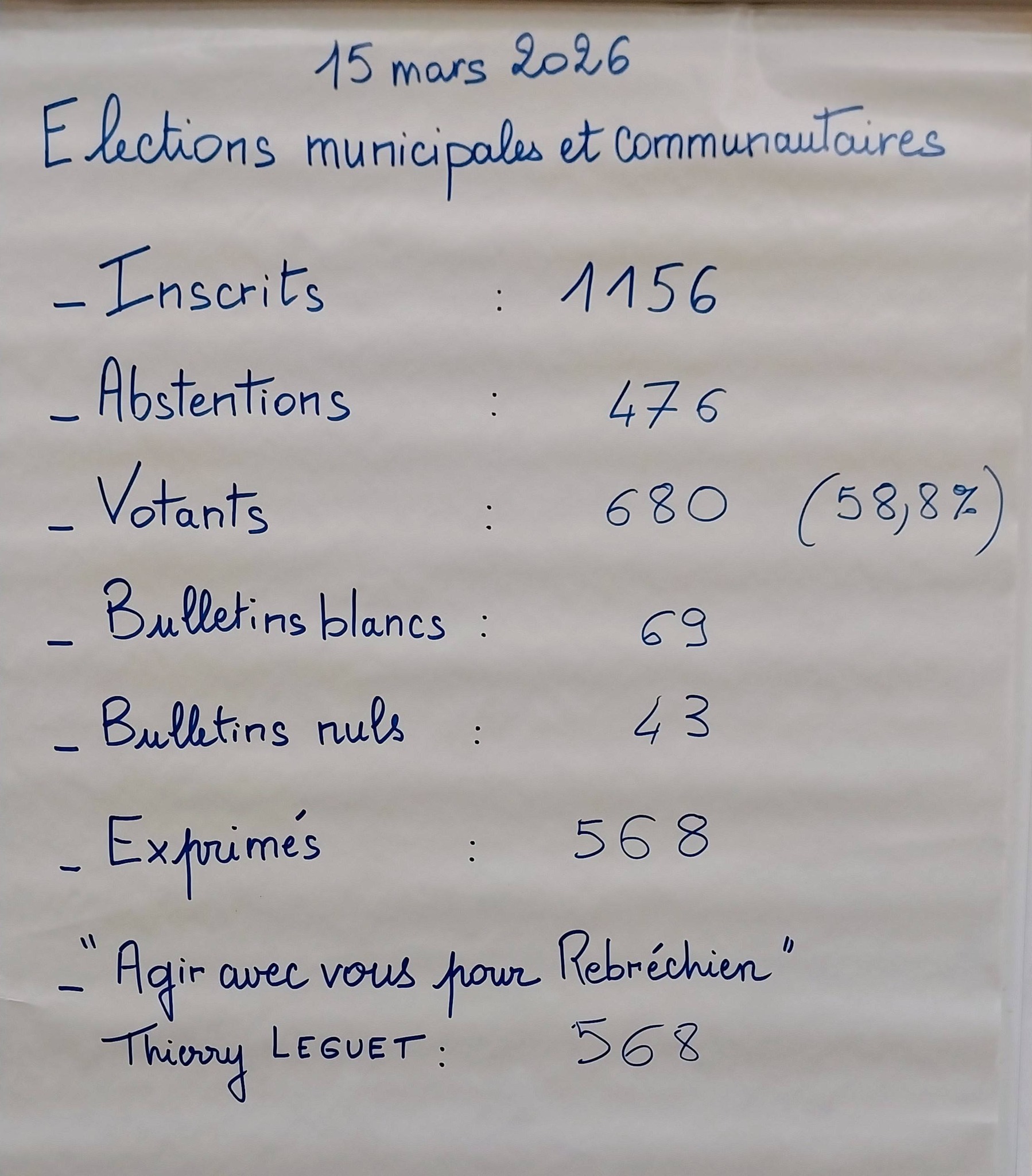 Les électeurs de Rebréchien (Loiret) étaient appelés aux urnes ce dimanche 15 mars 2026 pour le premier tour des élections municipales 2026. Une seule liste était candidate au scrutin municipal. Le taux de participation s’élève à 58.82 % (680 votants sur 1.156 inscrits). La liste conduite par Thierry LEGUET recueille 100.0 % des suffrages, soit 568 voix. Elle obtient 15 sièges au conseil municipal, conformément aux règles du scrutin de liste avec prime majoritaire.
